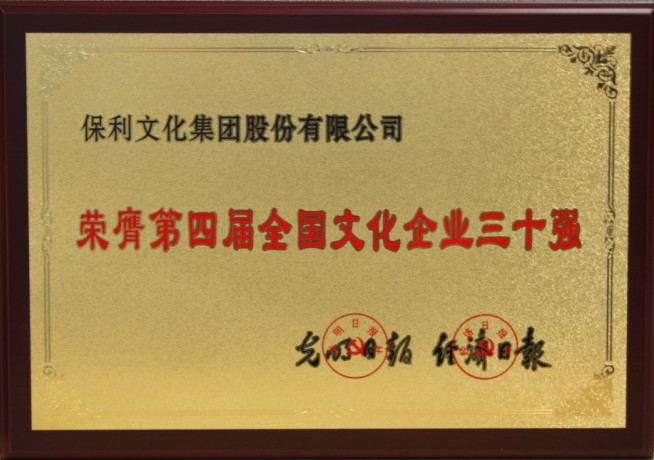 保利文化集團股份有限公司2004年被文化部命名為“文化產(chǎn)業(yè)示范基地”;2011年被文化部授予“十大最具影響力國家文化產(chǎn)業(yè)示范基地”稱號;2008年、2010年和2011年連續(xù)三屆入選“文化企業(yè)30強”。在第四屆的“文化企業(yè)30強”評選中,保利文化再度入選并蟬聯(lián)文化藝術(shù)類第一名,進一步確立了在中國文化企業(yè)第一陣營中的重要地位,提升了品牌美譽度和社會影響力,為實現(xiàn)跨越式發(fā)展打下了堅實的基礎(chǔ)。