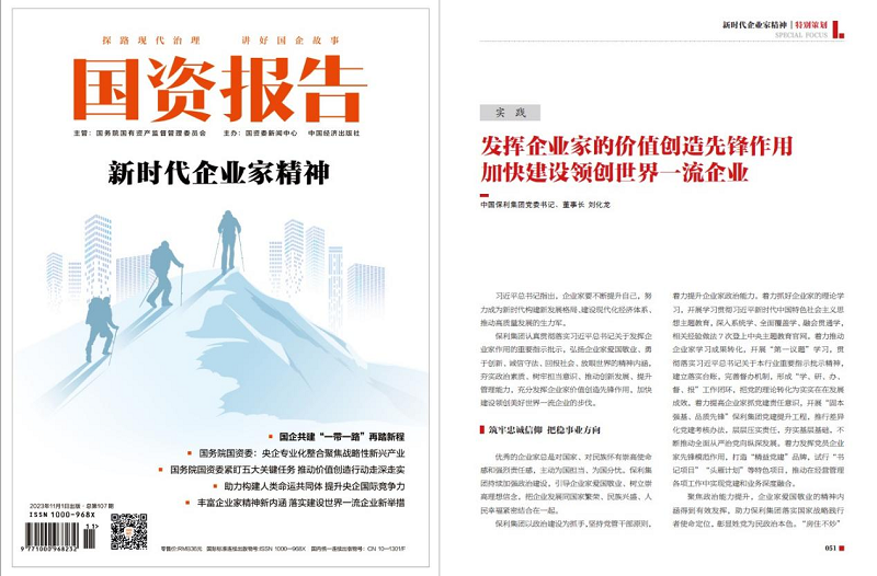 近日,《國資報(bào)告》雜志刊發(fā)保利集團(tuán)黨委書記、董事長劉化龍署名文章《發(fā)揮企業(yè)家的價(jià)值創(chuàng)造先鋒作用 加快建設(shè)領(lǐng)創(chuàng)世界一流企業(yè)》。文章聚焦保利集團(tuán)以政治建設(shè)、深化改革、體系搭建、完善治理體系為抓手,進(jìn)一步發(fā)揮好企業(yè)家頭雁作用,堅(jiān)定當(dāng)好高質(zhì)量發(fā)展執(zhí)行者、行動(dòng)派、實(shí)干家的成果成效。